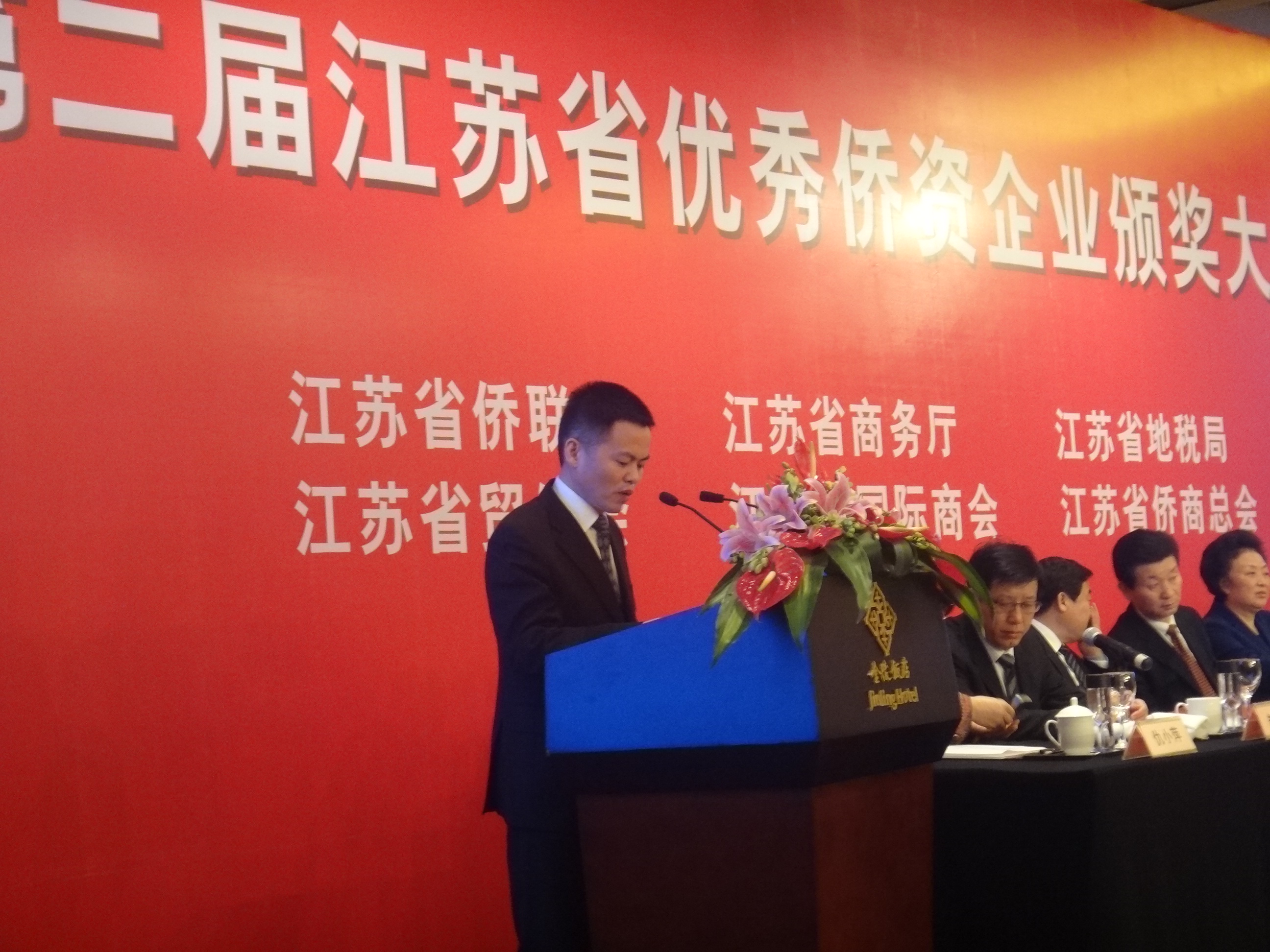12月28日,第二届江苏省优秀侨资企业颁奖大会在南京举行。省人大常委会副主任张艳、副省长张卫国、省政协副主席陈宝田出席大会,张卫国在表彰会上讲话,公司钱利荣董事长代表全省获奖的93家优秀侨资企业作了发言。