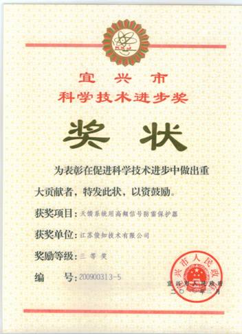 2010年3月,俊知技术自主研发的“天馈系统用高频信号防雷保护器”项目,荣获宜兴市政府颁发的“宜兴市科学技术进步奖”三等奖。同时该项目已于2008年荣获“江苏省高新技术产品”称号。