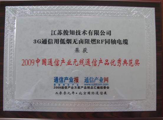 江苏俊知技术有限公司喜获“2009年度通信产业网产品库最受关注产品奖”,公司技术部姚文讯撰写的优秀论文《3G通信用无卤阻燃护套电缆的挤制工艺探讨》获得了“2009中国通信产业无线通信产品优秀典范奖”,俊知技术“地球篇”平面广告荣获“08-09年度通信产业影响力广告奖”。