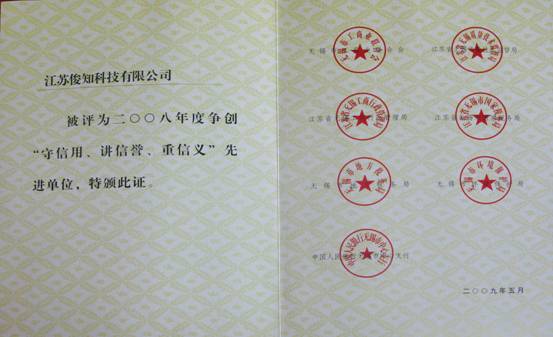 | 近日,江苏俊知技术有限公司获得了由无锡市工商业联合会、江苏省无锡质量技术监督局、江苏省无锡工商行政管理局、江苏省无锡市国家税务局、无锡市地方税务局、无锡市环境保护局、中国人民银行无锡市中心支行联合颁发的二〇〇八年度争创“守信用、讲信誉、重信义”先进单位证书。